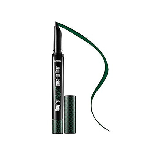 Details: Benefit Cosmetics Cosmetics cosmetics they're real! Push-up eyeliner beyond green 1.4g This matte green gel formula is waterproof and won't smudge, budge or dry out for 24 hours*. The innovative soft accuflex tip hugs your lash line from corner to corner...The closer the line, The bigger the eye! An innovative, waterproof, lash-hugging gel eyeliner pen that lasts for 24 hours-now available in four brilliant, wearable shades. Benefit Cosmetics cosmetics cosmetics they're real! Push-up liner is the first foolproof and budge-proof gel eyeliner in a pen. This eyeliner's soft accuflex tip is custom-angled to draw an easy line. Its flat, wide guard gently pushes lashes aside to get close to lash line. This product is an allure best of Beauty and beauty breakthrough award Winner. It is vegan-friendly, non-comedogenic, and does not contain latex. It lasts for up to 24 hours and is waterproof, and it should be removed before bedtime to prevent the blocking of pores.